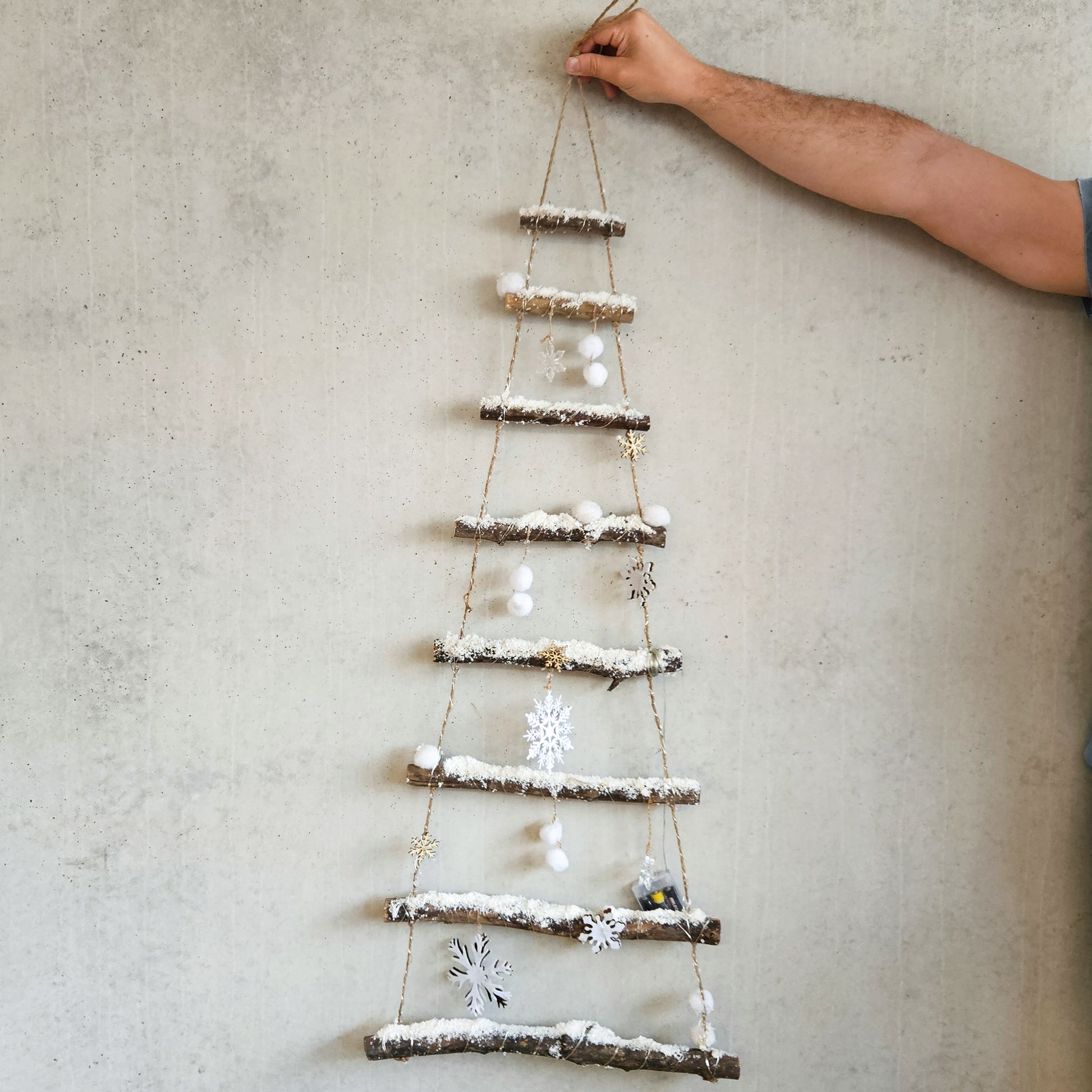 A minimalist, Scandi-style alternative to a full tree. Snow-kissed branches form a tall triangle adorned with snoflakes, pom-poms a micro-LED string. Requires 3 x AA batteried (not included).